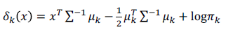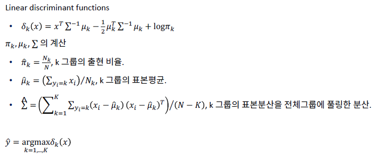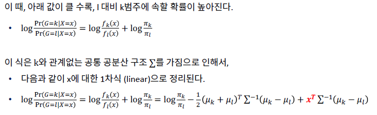 LDA의 확률모델은 log( fk(x)/ fl(x) ) + log(πk/πl) 이고, 0보다 크면 범주 k, 0보다 작으면 범주 l 에 속한다.