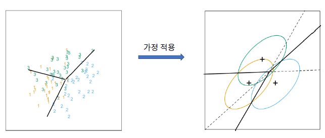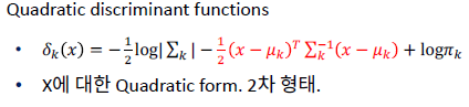 - y 범주별로 공분산 구조를 다르게 할 수 있음. (LDA는 1차식이기에, 공분산 구조를 같을 때만 분류가 가능하다)