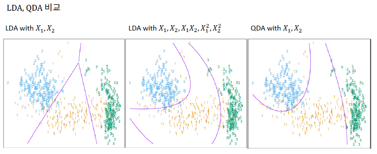 LDA의 function과 QDA의 function을 비교해보면, LDA는 1차식, QDA는 2차식이다.