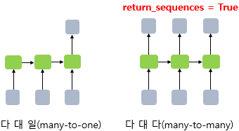 기존 RNN의 은닉층은 모든 시점에 대해서 은닉 상태값을 출력할 수 있고 <다 대 다>, 반대로 마지막 시점에 대해서만 은닉 상태값을 출력할 수 있다 <다 대 일>. 이는 인자로 return_sequences=True를 넣을 것인지, 넣지 않을 것인지로 설정할 수 있는데 태깅 작업의 경우에는 다-대-다(Many-to-Many) 문제로 return_sequences=True를 설정하여 출력층에 모든 은닉 상태값을 보내야한다.