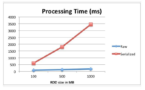 Serialized 한 caching을 하게 되면, RDD size가 클수록 raw caching 보다 공간은 엄청나게 집약적이지만, processing Time이 오래걸린다.