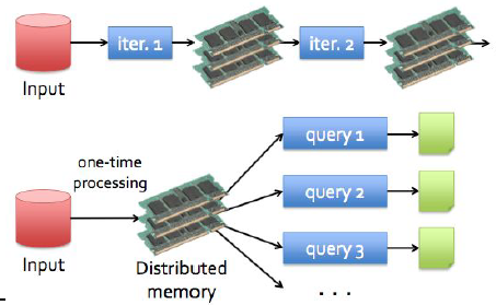 이 overhead를 줄이기 위해 제안한 방법이 중간 결과값 을 메모리에 올리는 방법이었으나 메모리는 휘발성이기 때문에 장애가 발생했을때 Fault-Tolerance를 유지하기 어려웠다. Twister나 Haloop처럼 반복 알고리즘을 위한 방법들이 제안되었으나 모두 MapReduce에 제한된 것이 한계였다.