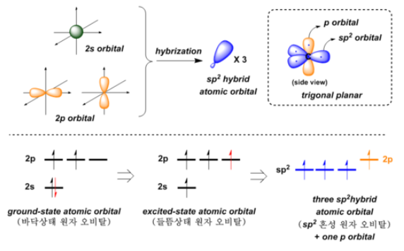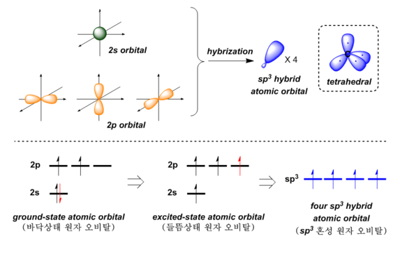 이 때 각 궤도함수 별로 에너지 준위가 다르기 때문에, 둘 이상의 궤도함수를 합쳐서 동일한 에너지 준위로 만드는 것!