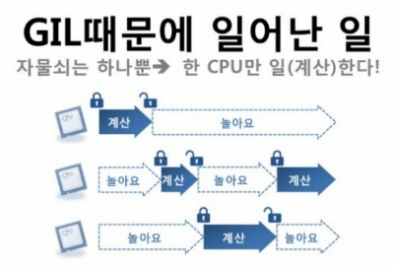 따라서 GIL은 여러 인터프리터가 진행하는 것을 막기 떄문에, 쓰레드를 늘려봤자 성능은 쓰레드 하나를 쓰는 것 과 같은 현상이 나온다. 그렇기 때문에 파이썬에서는 멀티쓰레딩을 지원하지 않는다. 그리고 멀티쓰레딩은 잘 써야하는게 멀티쓰레딩은 메모리를 건드리기 때문에 메모리 explode가 일어날 수 도 있다.