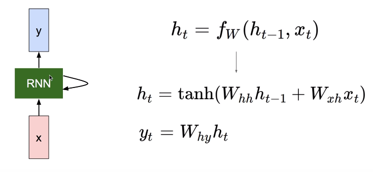 - RNN에서는 뉴런이라는 단위보다는 입력층과 출력층에서는 각각 입력 벡터 x와 출력 벡터 y, 은닉층에서는 은닉 상태(ht)라는 표현을 주로 사용합니다.