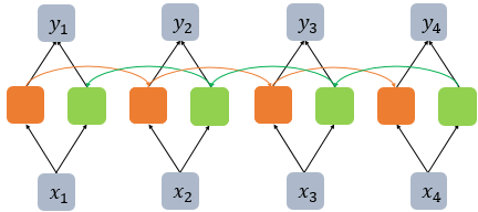 아래의 그림은 양방향 순환 신경망에서 은닉층이 1개 더 추가되어 은닉층이 2개인 깊은(deep) 양방향 순환 신경망의 모습을 보여줍니다.