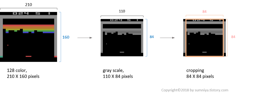 Atari 2600은 210x160 pixel의 colour image를 초당 60프레임 정도로 화면에 출력한다. 출력된 화면에 대해 다음과 같은 전처리 과정을 거쳐 84x84xm의 입력데이터를 얻는다[6]. (논문에서는 m을 4로 설정)