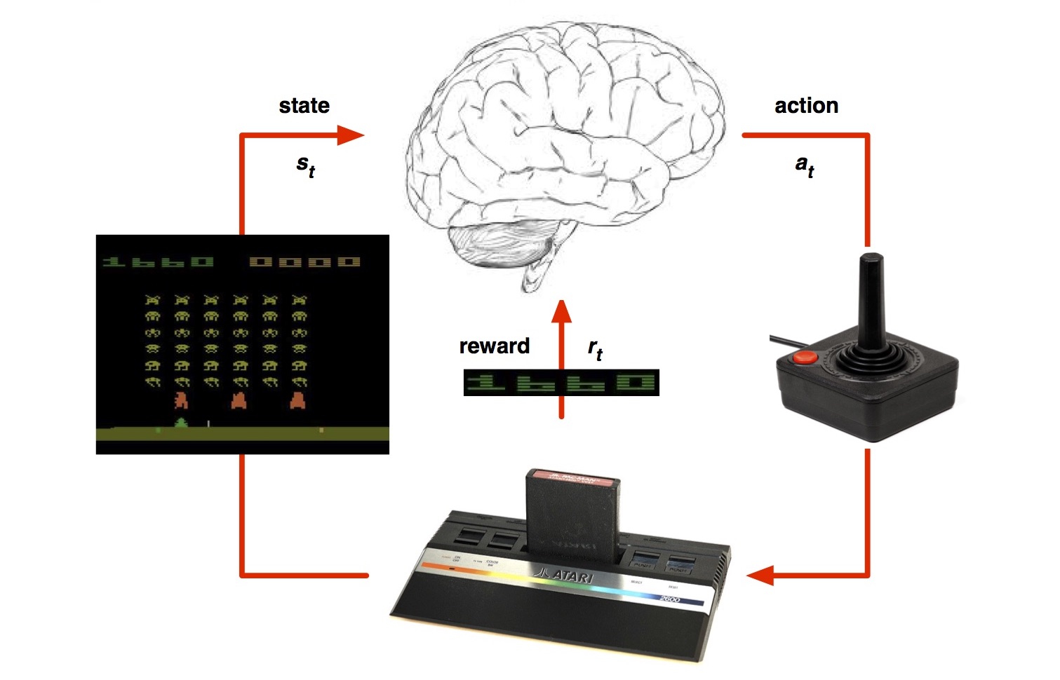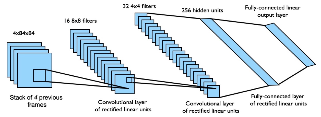 Input state 는 이전의 크기의 프레임 4장이고, Output은 18개의 joystick/button 동작에 대한 값, Reward는 score의 변경 값입니다.