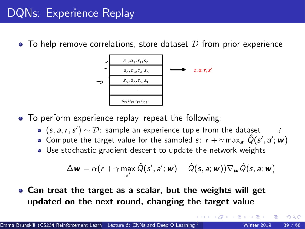- 주의할 점은, experience replay를 사용할 땐, 반드시 off-policy로 learning해야하는데, 이는 current parameter가 update하는 sample들과 다르기 때문이다.