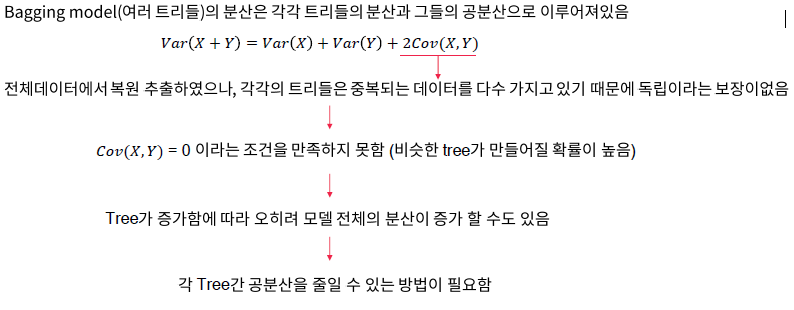 독립일 때는 서로 상관관계가 존재하지 않는다. Bagging을 복원추출하기 때문에 각각의 트리들을 독립하지 않고, 이는 공분산이 0이 아니라는 의미 (비슷한 tree구조가 만들어질 확률이 높다.) 이다. 따라서 Tree, base learner들이 많아짐에 따라 모델 전체의 분산이 증가하게 될 수도 있어 예측률을 떨어뜨릴 수 있다.