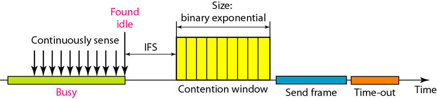 - 1-persistence method : station이 line idle을 발견한다면 frame을 즉시 다시 보낸다.