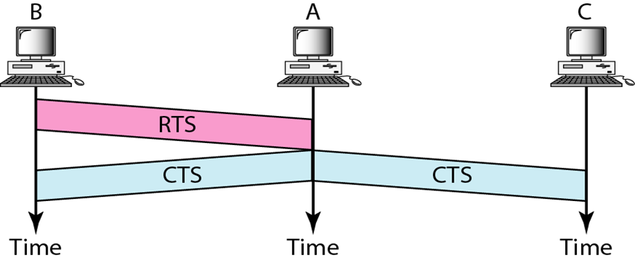 이 때, B가 A에 데이터를 보내려고 할 때, 만약 C가 연결되어서 데이터를 이미 보내고 있었다면, 이는 collision이 발생할 것이다. 이러함을 방지하기 위해 CTS를 양쪽으로 보낸다.