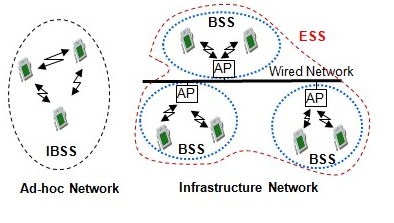 - BSS는 AP 없이 data를 주고 받을 수 없다. (Wi-Fi) AP 가 없다면 BSS에서는 Ad hoc이라는 독자적인 network를 구성