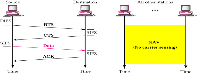 - DIFS (Distributed interframe space)가 끝나면, RTS (Request To Send)를 보내 handshake한다. 이 때 다른 station들은 NAV (Network Allocation Vector)를 걸어둔다.