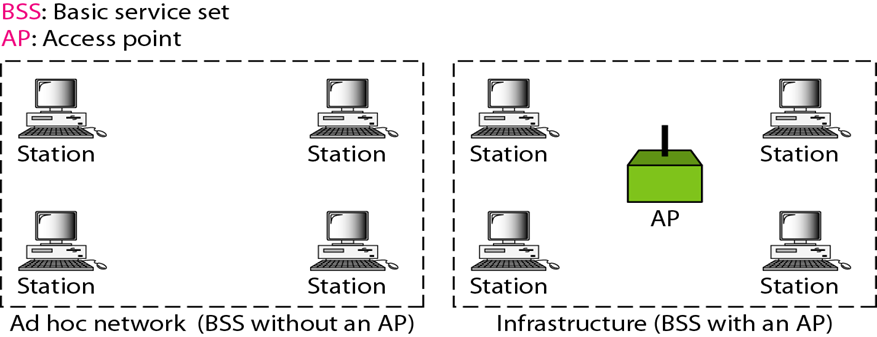 - BSS는 Access point라는 중앙 base station이 존재하고 이를 통해 mobile이든 컴퓨터든 station들이 통신을 한다.