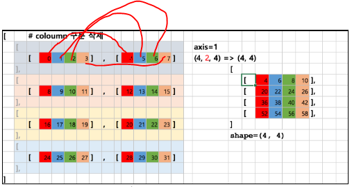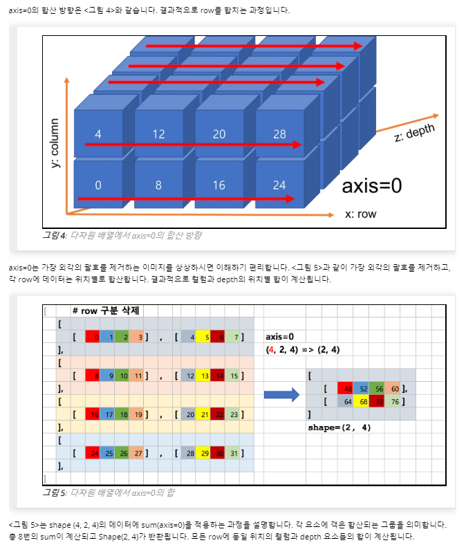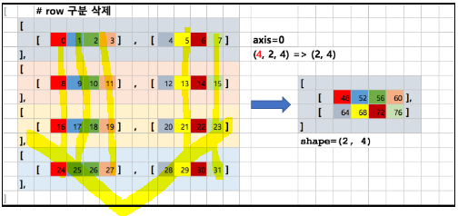 - axis=0 이면, 여러 row들을 한 개로 합치는 역할이며 (x,y,z) -> (y,z) 로 shape가 변환된다.