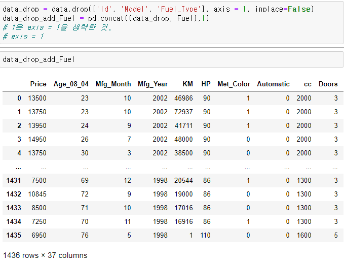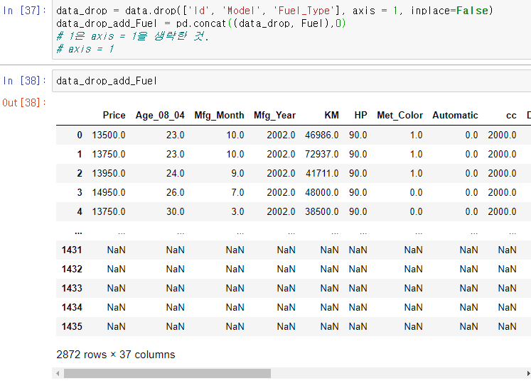 그래서 ID, Model, Fuel_Type을 가지고 있는 data를 붙였을 때, 밑으로 붙기 때문에 뒤에 붙은 데이터들에서 Price, Age_08_04~ columns들 부분에 대해서는 NaN 공란이 되어 나타난다.