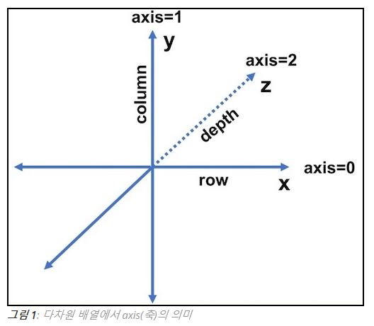 > axis는 수직축을 말하며, 위와 같은 그림처럼 axis를 0,1,2 로 3차원 공간을 구분한다.