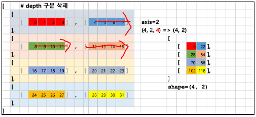 - axis=2 이면, column의 depth를 가진 값으로 축소하며 (x,y,z) -> (x,y)로 shape가 변환된다.