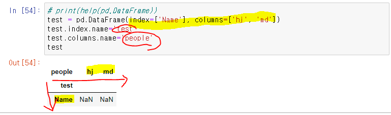 DataFrame을 정의하고 부르는 index.name은 정말 index의 name을 정의해주는 것이기에 표위에 "test"처럼 index들의 특성을 나타내기 쉽다.