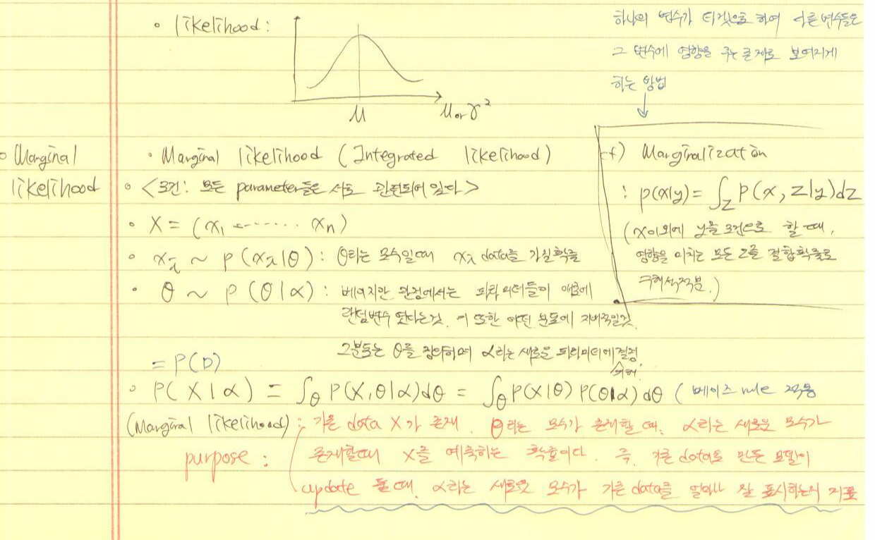 Marginal Likelihood는 두 가지 관점에서 이야기할 수 있는데, 첫 번째는 말그대로 marginalize 하여 가능도를 구한다는 개념으로 어떠한 파라미터를 지정해서 그것에 대한 가능도를 구하면서 나머지 파라미터들은 marginalize 하면 된다. (marginalize 한다는 것은 영어로는 marginalized out == integrated out 이라고 표현한다) 두 번째로는 베이지안 관점에서는 단지 베이즈 이론에서 Evidence에 해당하는 즉, 데이터에 대한 확률 부분을 일컫는 말이다. 왜냐하면 사실 이 부분은 데이터의 확률을 구하기 위해서 위의 그림에서 그려진 오른쪽 항의 분자를 marginalize 하기 때문이다.