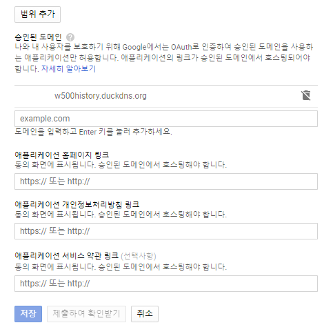 승인된 도메인에 내가 주소로 걸어둘 도메인을 적어준다. 그 후 저장을 눌러준다.
