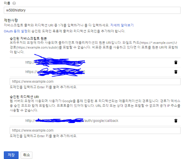 그래서 위에서 적어준 주소 + /auth/google/callback 을 붙여서 저장한다.