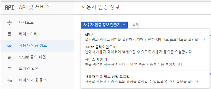 그 다음 사용자 인증 정보 만들기를 들어가서 웹어플리케이션으로 정해준다.