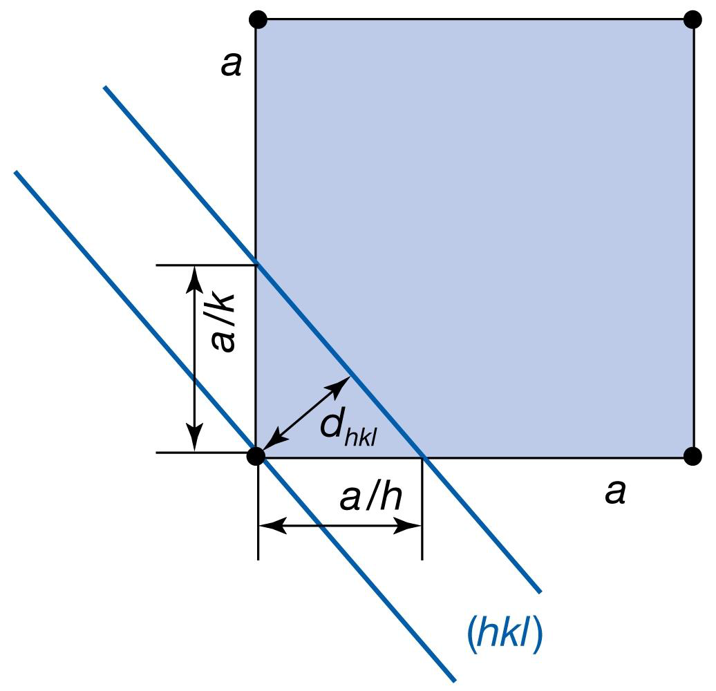 {hkl} 평면의 lattice : $1/d_{hkl}^2 = (h^2/a^2+k^2/b^2+l^2/c^2)$ - lattice point를 자르는 평면과의 관계 & unit cell의 차원 서로 연관이 있다.
